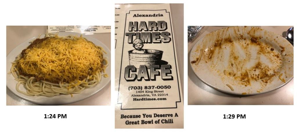ZT was in Washington DC and had a chance to go to one of his favorite places from his days living in Alexandria. Hard Times Cafe…love it and their slogan “Because You Deserve A Great Bowl of Chili”….As noted below, ZT may not have the same time in the 40 but he can still knock out a plate of chili at Hard Times!!!