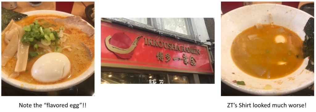 ZT was in Toronto working and had the opportunity to have some REAL Ramen from an actual Ramen restaurant ( remember, being from the south, ZT was under the belief all Ramen was served in styrofoam cup after about 90 seconds in a microwave ). It did not disappoint and was quickly consumed, as normal. ZT did note the amount of “shirt splatter” from his Ramen eating technique was equal to being hit with a Super Soaker gun full of brown broth!